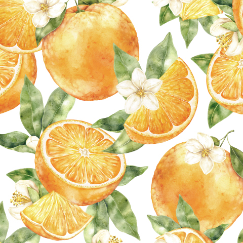 акварельные апельсины, листья и цветы