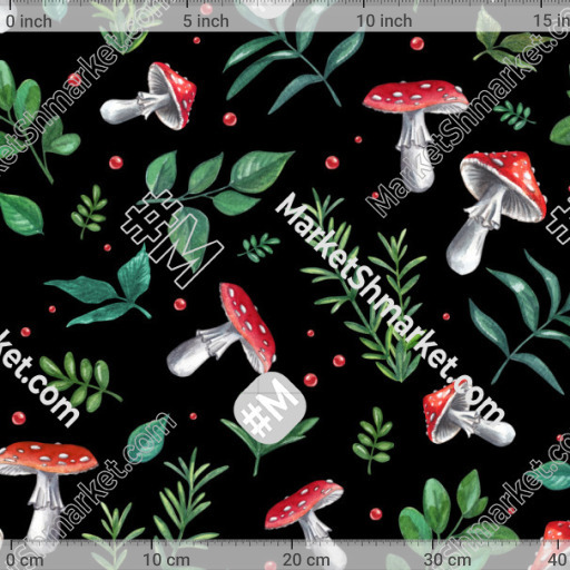 Акварельные мухоморы и листья на черном фоне by Loft Bat 178 DPI
