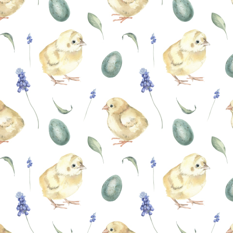 Акварельные цыплята, яйца и цветы мускари на белом фоне.