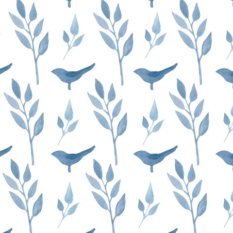 Акварельный паттерн с синими листьями и силуэтом птиц