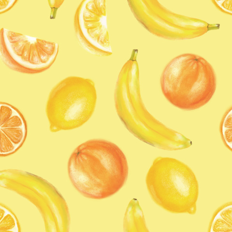 Апельсин, лимон, банан. Фрукты на желтом фоне