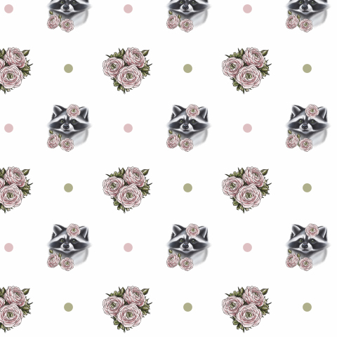 Енотики и нежные цветы на белом фоне с горошком