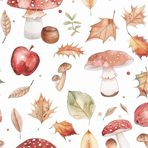 Грибы, мухоморы и листья на белом фоне. Осенний принт 3