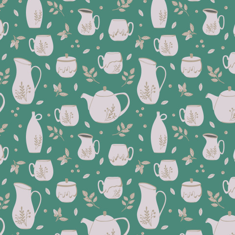 Керамическая посуда, ягоды и листья. Ретро орнамент.