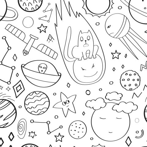 Кот в космосе. Планеты. Дудлы. Черно-белый