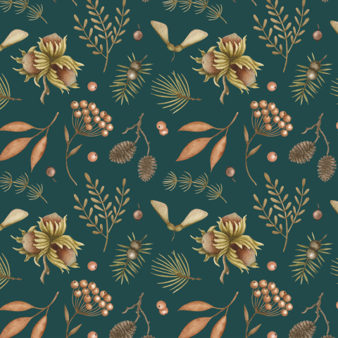 Лесной с листьями, орехами, шишками и ягодами зелёный