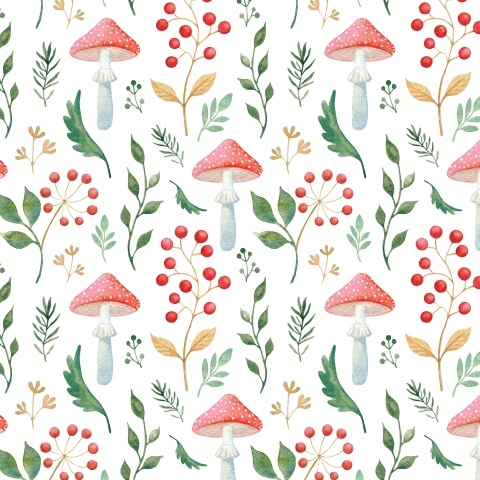 Лесной узор: красные грибы, ягоды, зелёные листья
