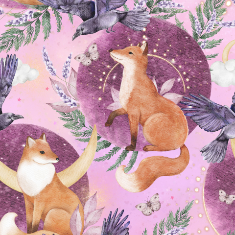 Магический мистический с лисами, воронами, папоротником на розовом
