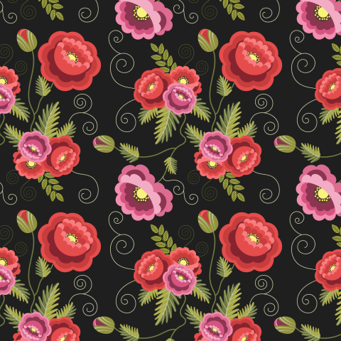 маки букет вышивка листья узор красный лиловый желтый сиреневый черный ретро