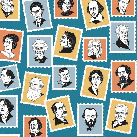 Марки с великими писателями на синем фоне