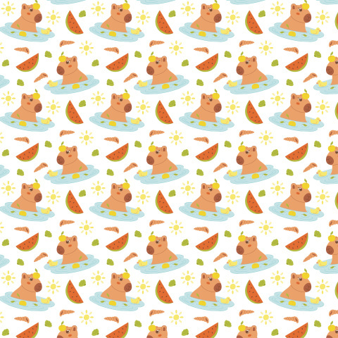 Милая капибара в воде с арбузом, мандаринами и резиновой уточкой