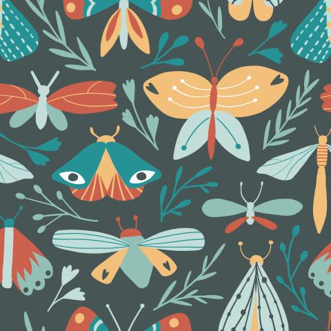 Милые бабочки и мотыльки в дудл стиле на темном фоне