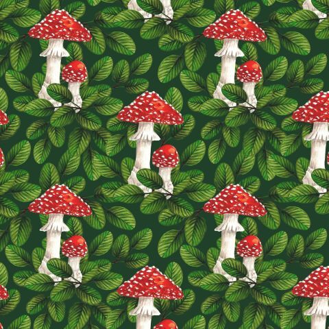 Мухоморы и листья на темно-зеленом
