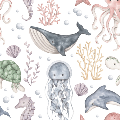 море, акварель, рисунок, нарисованный, океан, морские животные, кит, дельфин, черепаха, осьминог, медуза, звезда, пузыри, водоросли, коралл