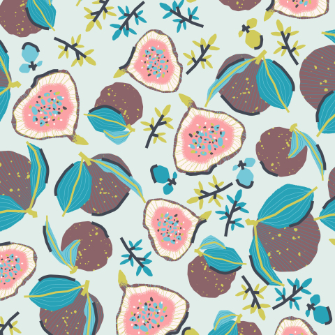 Принт с инжиром и листьями на голубом фоне