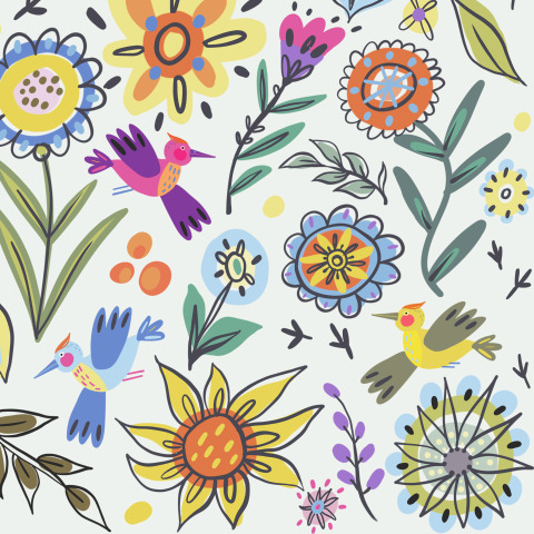 птицы цветы принт для детей ткань разноцветный детский яркий пестрый на белом растения забавныепринт паттерн цветущиерастения природа ботанический стилизованный летний весенний листья декоративные цветы