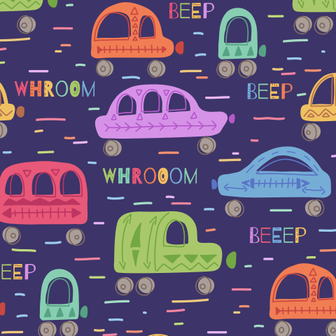 машина, машинка, детский, транспорт, автомобиль, авто, узор, трайбл, разноцветный, на темном фоне, темный фон, этнический, дорога, милый, стилизованный, колеса, яркий, текст, слова, паттерн, полоса, врум, бип, разноцветный, автобус, фиолетовый, ночь, текст