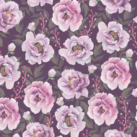 Розовые пионы на бордовом фоне с веточками и листьями.