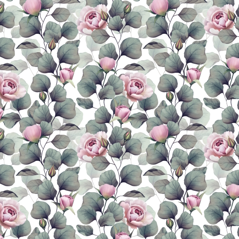 Розовые розы и эвкалипт на белом