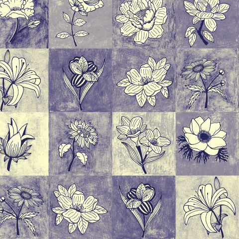 Seamless watercolor pattern of squares and flowers.