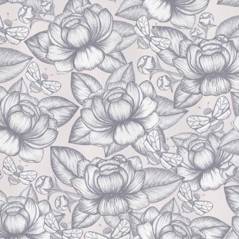 Серые цветы на розовом фоне. Цветочный узор Пионы и пчелы