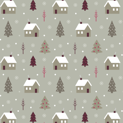Скандинавские домики ёлки и снежинки на сером фоне