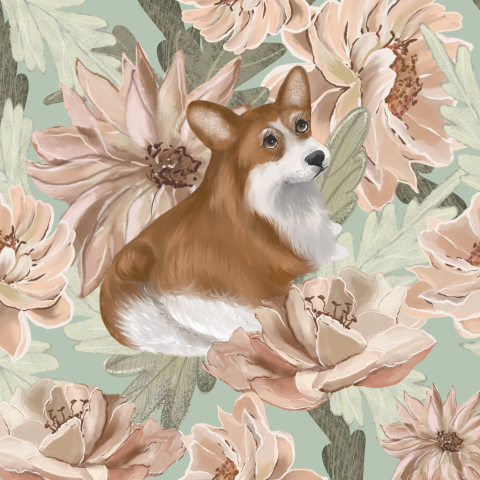 корги, собака, животные, пастельный, нежный, пес, домашний, цветочный, ботанический
