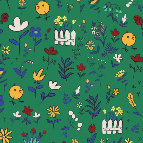 Цыплята птички веселые цветочки цветы растения поляна мультяшные детские забор следы милые тюльпаны розы колокольчики листья лето весна