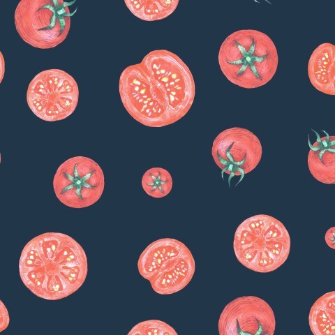 Узор из целых помидоров и половинок на темном фоне.
