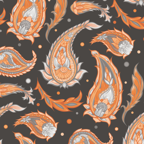 пейсли, этнический, бохо, цветочный, узор, на темном фоне, темный фон, капля, листва, трайбл, этнический, бута, индийский, орнамент, полька, точка, листья, лиственный, капля, оранжевый, серый