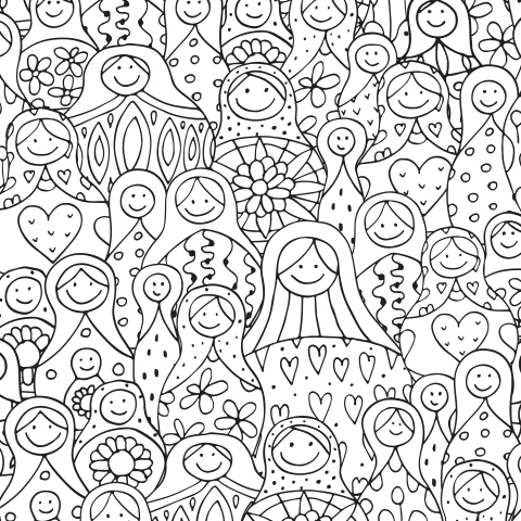 Веселые матрешки на белом фоне. Раскраска