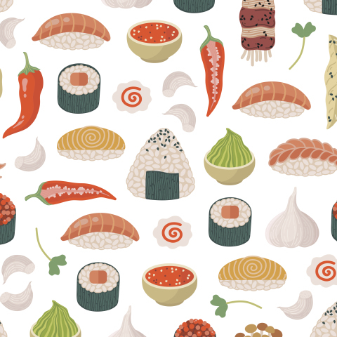 Японская еда: онигири, суши, роллы, морепродукты, васаби
