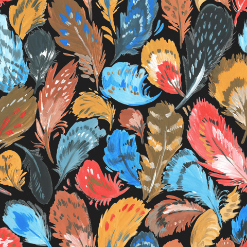 Яркий узор с птичьими перьями на черном фоне