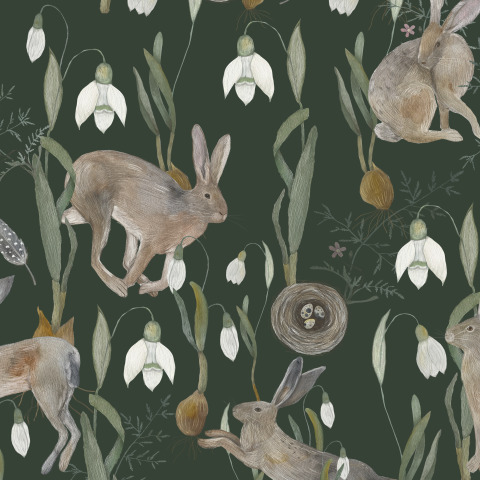 Зайчики и подснежники (темно-зеленый фон)