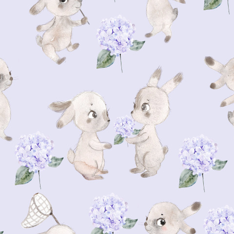 Зайцы и гортензии на сиреневом