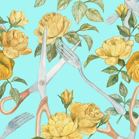 #ботанический #цветы #розы #предметы #акварельный #кухня #голубой #желтый #ботаника #растительный #листья #вилка #цветочный #современный #креативный #интерьер #женский #лето #весна #ножницы #контраст #акварель #живопись #винтаж