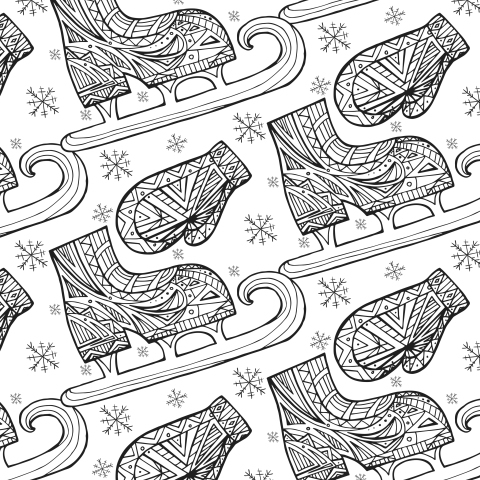 зима, спорт, снежинки, снег, коньки, варежки, этно, трайбл, узор, бохо, на белом фоне, белый фон, дудл, спорт, обувь, одежда, лёд, черно белый, монохромный, контурный рисунок, скетч